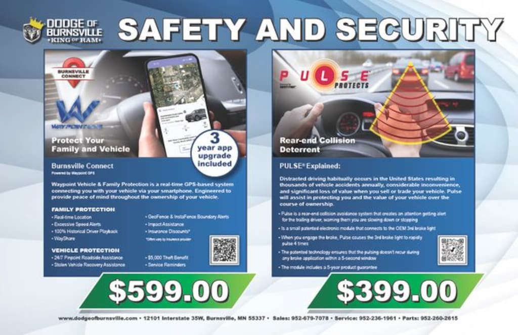 As the premier Dodge and Ram dealership in the Burnsville, Minnesota area, Dodge of Burnsville takes pride in finding the vehicle that best suits your lifestyle. Nobody sells or stocks more Ram vehicles than the King of Ram! Come into our Burnsville, Minnesota dealership today to see our unbeatable prices on everything from a new Ram 1500 to an affordable pre-owned vehicle. Since Dodge of Burnsville's founding in 1983 by John Adamich, treating each customer as part of the King of Ram family has been our number one priority. Our emphasis on quality work and fair prices are why more people turn to the King of Ram than any other dealership in Minnesota for their Ram truck needs. * THIS VEHICLE IS EQUIPPED WITH A SAFETY AND SECURITY PACKAGE INCLUDING PULSE AND SYNCHRONIZE GPS (3- YEAR SUBSCRIPTION) FOR AN ADDITIONAL $998 ABOVE THE ADVERTISED PRICE.