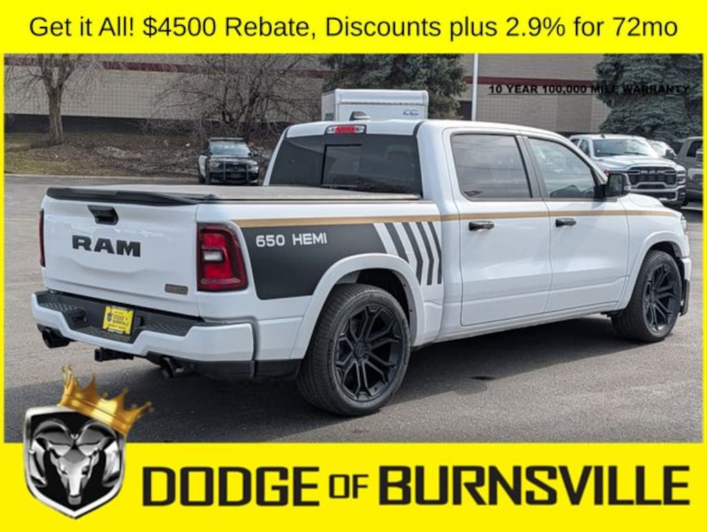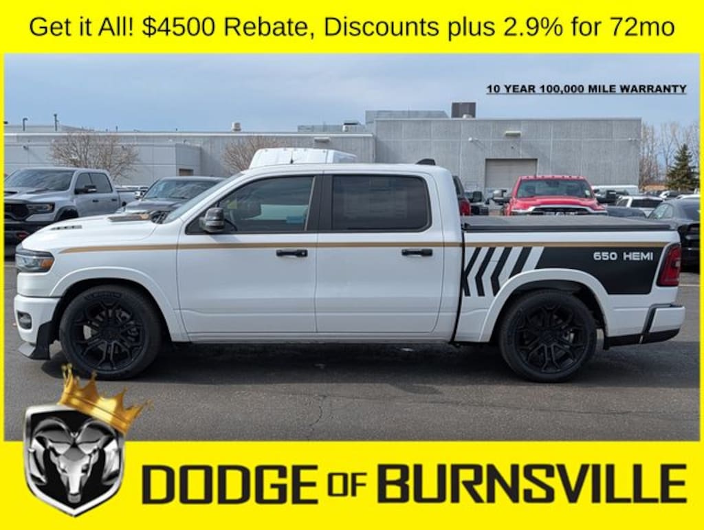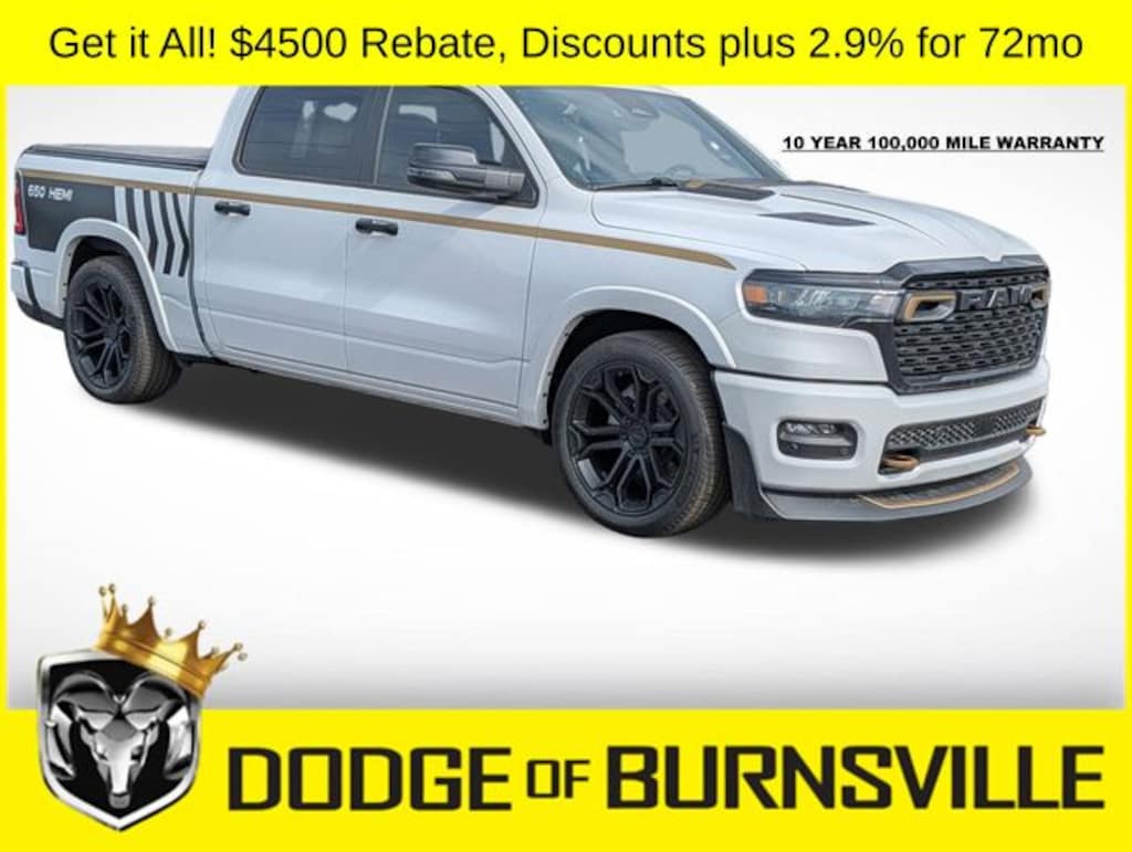 As the premier Dodge and Ram dealership in the Burnsville, Minnesota area, Dodge of Burnsville takes pride in finding the vehicle that best suits your lifestyle. Nobody sells or stocks more Ram vehicles than the King of Ram! Come into our Burnsville, Minnesota dealership today to see our unbeatable prices on everything from a new Ram 1500 to an affordable pre-owned vehicle. Since Dodge of Burnsville's founding in 1983 by John Adamich, treating each customer as part of the King of Ram family has been our number one priority. Our emphasis on quality work and fair prices are why more people turn to the King of Ram than any other dealership in Minnesota for their Ram truck needs. * THIS VEHICLE IS EQUIPPED WITH A SAFETY AND SECURITY PACKAGE INCLUDING PULSE AND SYNCHRONIZE GPS (3- YEAR SUBSCRIPTION) FOR AN ADDITIONAL $998 ABOVE THE ADVERTISED PRICE. Sale Price includes: $1000 - 2026 Midwest BC Regional Retail Bonus Cash. Exp. 04/30/2026 $3500 - 2026 National Retail Bonus Cash . Exp. 04/30/2026 Price does not include dealer added accessories.