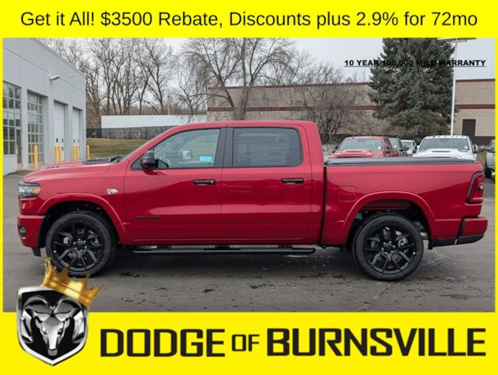 As the premier Dodge and Ram dealership in the Burnsville, Minnesota area, Dodge of Burnsville takes pride in finding the vehicle that best suits your lifestyle. Nobody sells or stocks more Ram vehicles than the King of Ram! Come into our Burnsville, Minnesota dealership today to see our unbeatable prices on everything from a new Ram 1500 to an affordable pre-owned vehicle. Since Dodge of Burnsville's founding in 1983 by John Adamich, treating each customer as part of the King of Ram family has been our number one priority. Our emphasis on quality work and fair prices are why more people turn to the King of Ram than any other dealership in Minnesota for their Ram truck needs. * THIS VEHICLE IS EQUIPPED WITH A SAFETY AND SECURITY PACKAGE INCLUDING PULSE AND SYNCHRONIZE GPS (3- YEAR SUBSCRIPTION) FOR AN ADDITIONAL $998 ABOVE THE ADVERTISED PRICE. Sale Price includes: $3500 - 2026 National Retail Bonus Cash . Exp. 04/30/2026