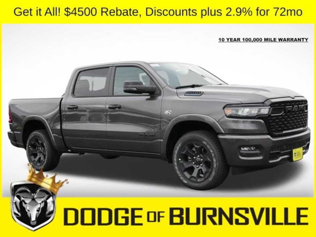 As the premier Dodge and Ram dealership in the Burnsville, Minnesota area, Dodge of Burnsville takes pride in finding the vehicle that best suits your lifestyle. Nobody sells or stocks more Ram vehicles than the King of Ram! Come into our Burnsville, Minnesota dealership today to see our unbeatable prices on everything from a new Ram 1500 to an affordable pre-owned vehicle. Since Dodge of Burnsville's founding in 1983 by John Adamich, treating each customer as part of the King of Ram family has been our number one priority. Our emphasis on quality work and fair prices are why more people turn to the King of Ram than any other dealership in Minnesota for their Ram truck needs. * THIS VEHICLE IS EQUIPPED WITH A SAFETY AND SECURITY PACKAGE INCLUDING PULSE AND SYNCHRONIZE GPS (3- YEAR SUBSCRIPTION) FOR AN ADDITIONAL $998 ABOVE THE ADVERTISED PRICE. Sale Price includes: $1000 - 2026 Midwest BC Regional Retail Bonus Cash. Exp. 04/30/2026 $3500 - 2026 National Retail Bonus Cash . Exp. 04/30/2026