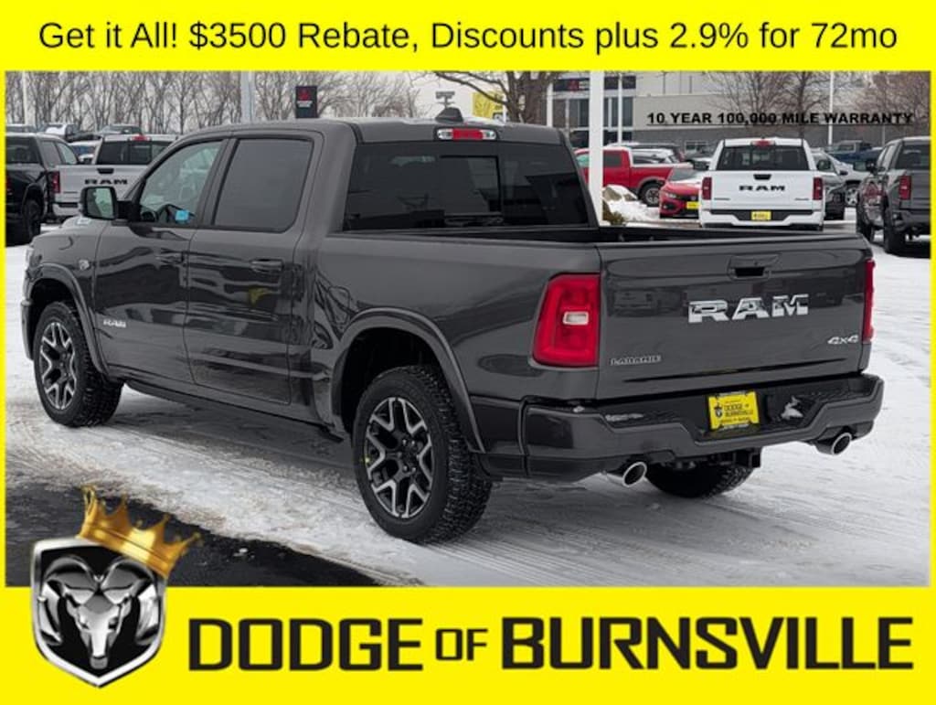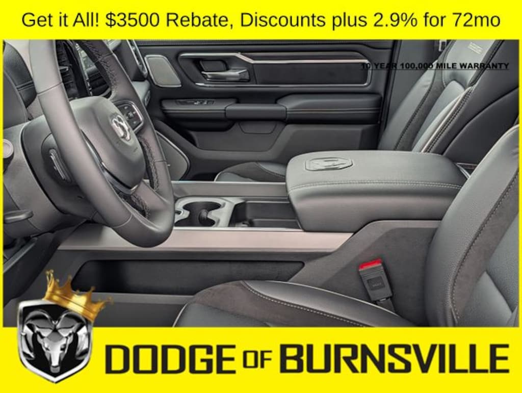 As the premier Dodge and Ram dealership in the Burnsville, Minnesota area, Dodge of Burnsville takes pride in finding the vehicle that best suits your lifestyle. Nobody sells or stocks more Ram vehicles than the King of Ram! Come into our Burnsville, Minnesota dealership today to see our unbeatable prices on everything from a new Ram 1500 to an affordable pre-owned vehicle. Since Dodge of Burnsville's founding in 1983 by John Adamich, treating each customer as part of the King of Ram family has been our number one priority. Our emphasis on quality work and fair prices are why more people turn to the King of Ram than any other dealership in Minnesota for their Ram truck needs. * THIS VEHICLE IS EQUIPPED WITH A SAFETY AND SECURITY PACKAGE INCLUDING PULSE AND SYNCHRONIZE GPS (3- YEAR SUBSCRIPTION) FOR AN ADDITIONAL $998 ABOVE THE ADVERTISED PRICE. Sale Price includes: $3500 - 2026 National Retail Bonus Cash . Exp. 04/30/2026