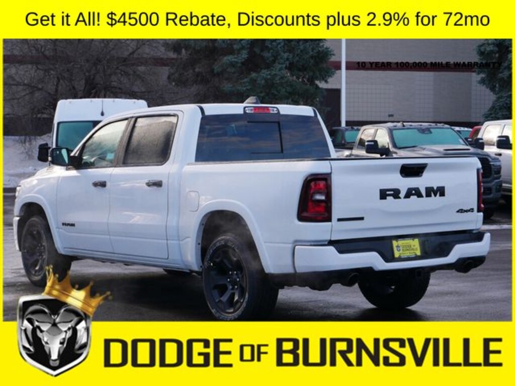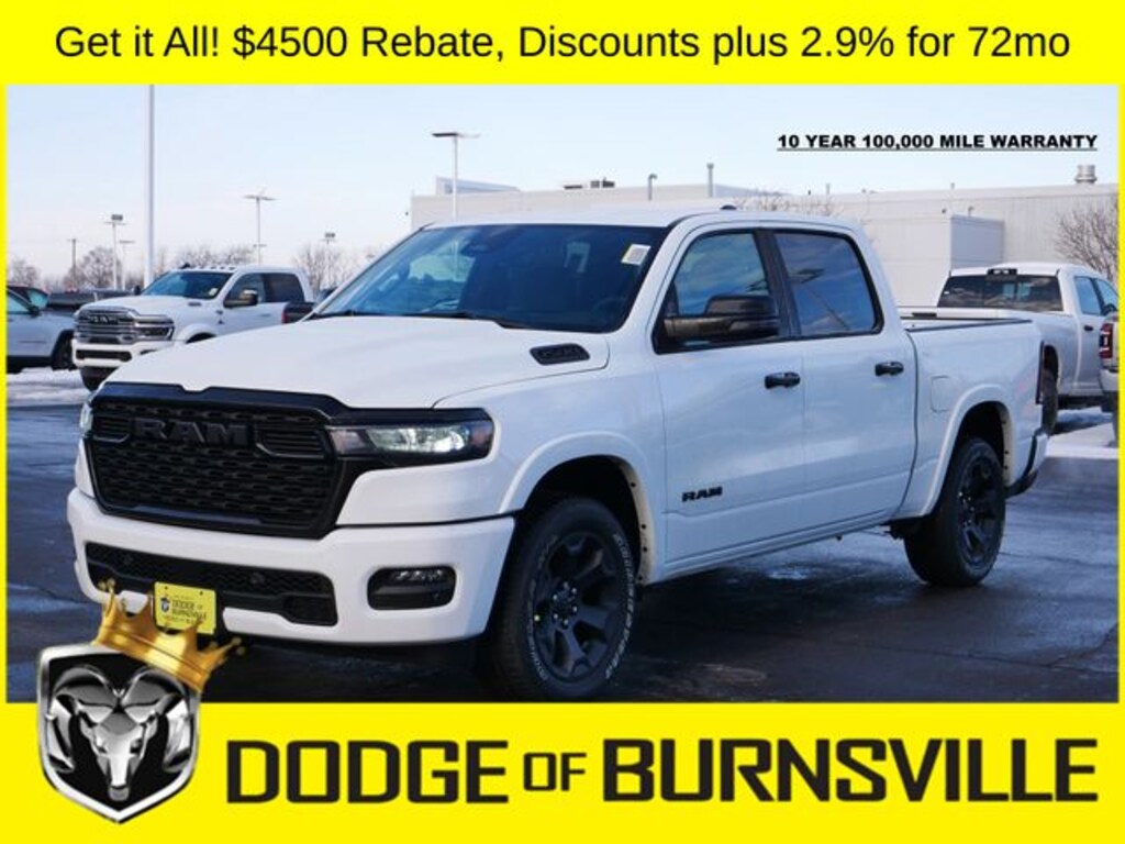 As the premier Dodge and Ram dealership in the Burnsville, Minnesota area, Dodge of Burnsville takes pride in finding the vehicle that best suits your lifestyle. Nobody sells or stocks more Ram vehicles than the King of Ram! Come into our Burnsville, Minnesota dealership today to see our unbeatable prices on everything from a new Ram 1500 to an affordable pre-owned vehicle. Since Dodge of Burnsville's founding in 1983 by John Adamich, treating each customer as part of the King of Ram family has been our number one priority. Our emphasis on quality work and fair prices are why more people turn to the King of Ram than any other dealership in Minnesota for their Ram truck needs. * THIS VEHICLE IS EQUIPPED WITH A SAFETY AND SECURITY PACKAGE INCLUDING PULSE AND SYNCHRONIZE GPS (3- YEAR SUBSCRIPTION) FOR AN ADDITIONAL $998 ABOVE THE ADVERTISED PRICE. Sale Price includes: $1000 - 2026 Midwest BC Regional Retail Bonus Cash. Exp. 04/30/2026 $3500 - 2026 National Retail Bonus Cash . Exp. 04/30/2026