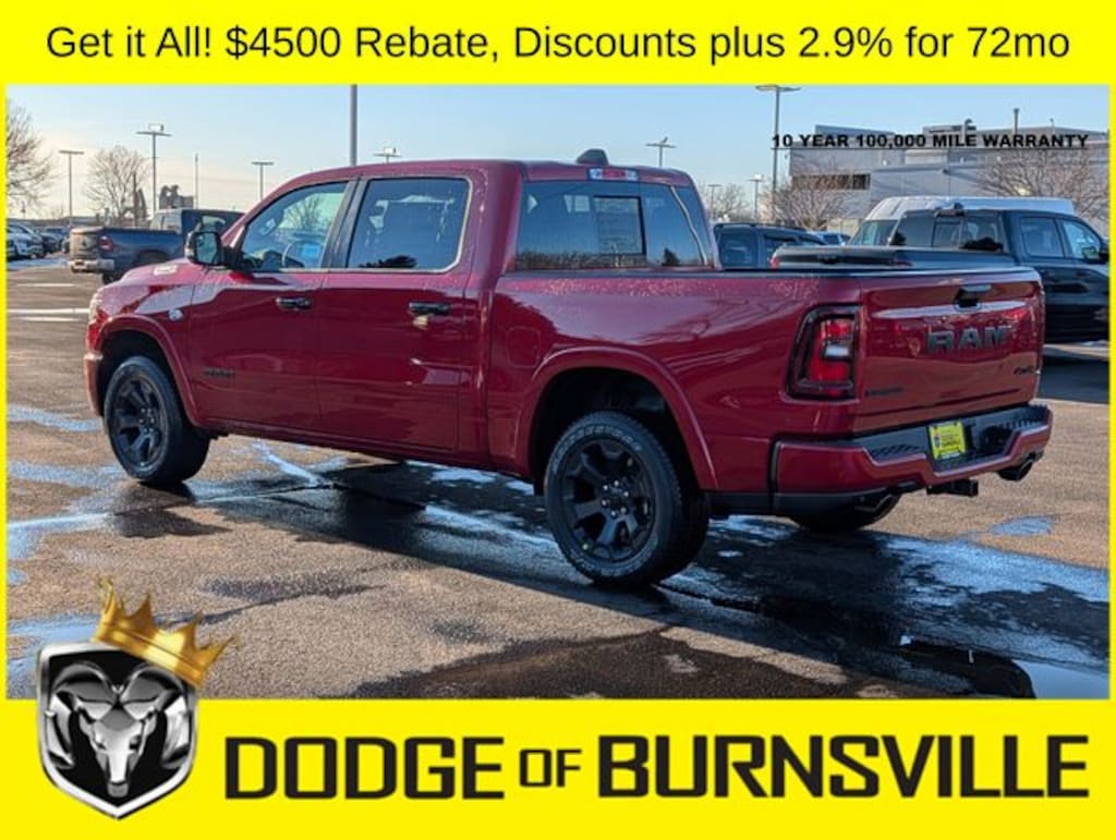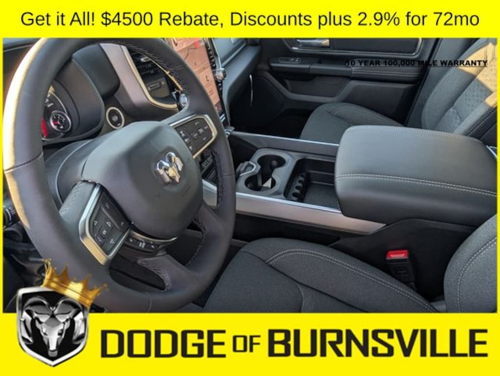 As the premier Dodge and Ram dealership in the Burnsville, Minnesota area, Dodge of Burnsville takes pride in finding the vehicle that best suits your lifestyle. Nobody sells or stocks more Ram vehicles than the King of Ram! Come into our Burnsville, Minnesota dealership today to see our unbeatable prices on everything from a new Ram 1500 to an affordable pre-owned vehicle. Since Dodge of Burnsville's founding in 1983 by John Adamich, treating each customer as part of the King of Ram family has been our number one priority. Our emphasis on quality work and fair prices are why more people turn to the King of Ram than any other dealership in Minnesota for their Ram truck needs. * THIS VEHICLE IS EQUIPPED WITH A SAFETY AND SECURITY PACKAGE INCLUDING PULSE AND SYNCHRONIZE GPS (3- YEAR SUBSCRIPTION) FOR AN ADDITIONAL $998 ABOVE THE ADVERTISED PRICE. Sale Price includes: $1000 - 2026 Midwest BC Regional Retail Bonus Cash. Exp. 04/30/2026 $3500 - 2026 National Retail Bonus Cash . Exp. 04/30/2026