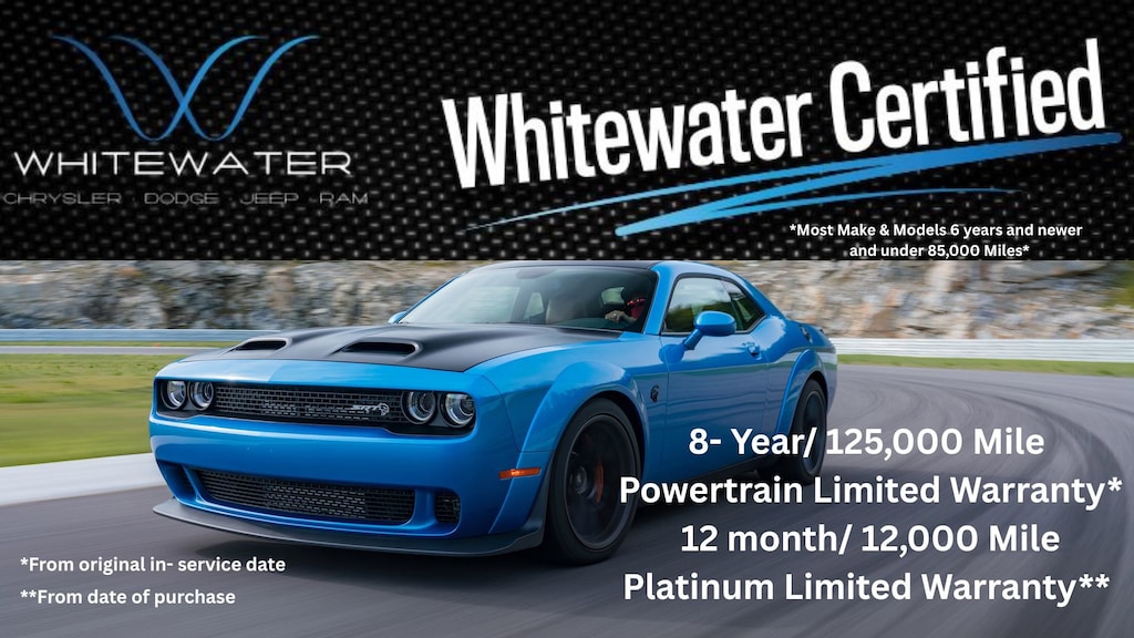 Certification Program Details: WHITEWATER CERTIFIED! 12 month/ 12,000 Platinum limited warranty (from date of purchase) 96 month/ 125,000 Powertrain limited warranty (from original in-service date) Car Rental Allowance First day Rental Roadside Assistance Guaranteed 2 keys Aggressive finance options compared to regular used vehicle